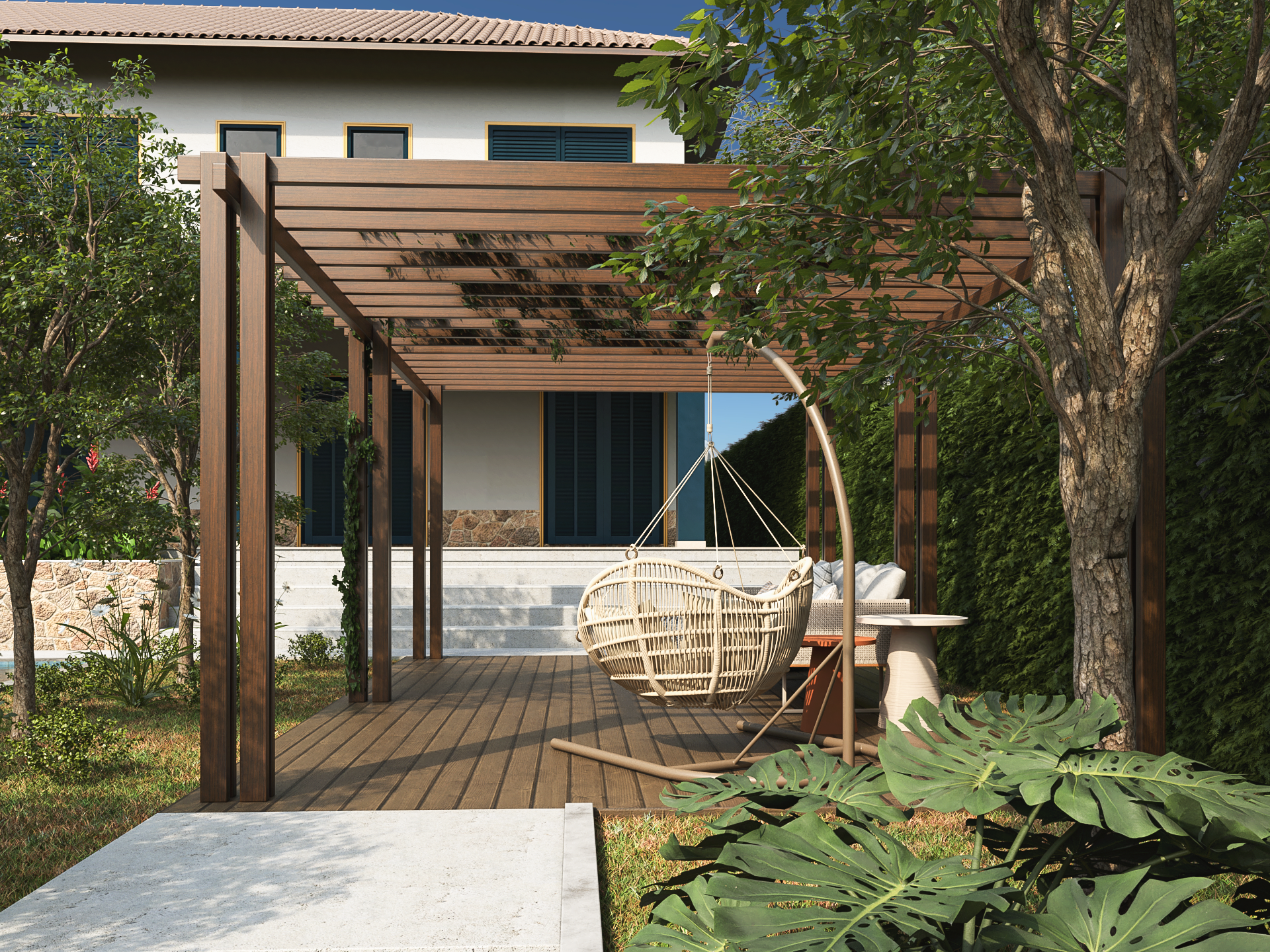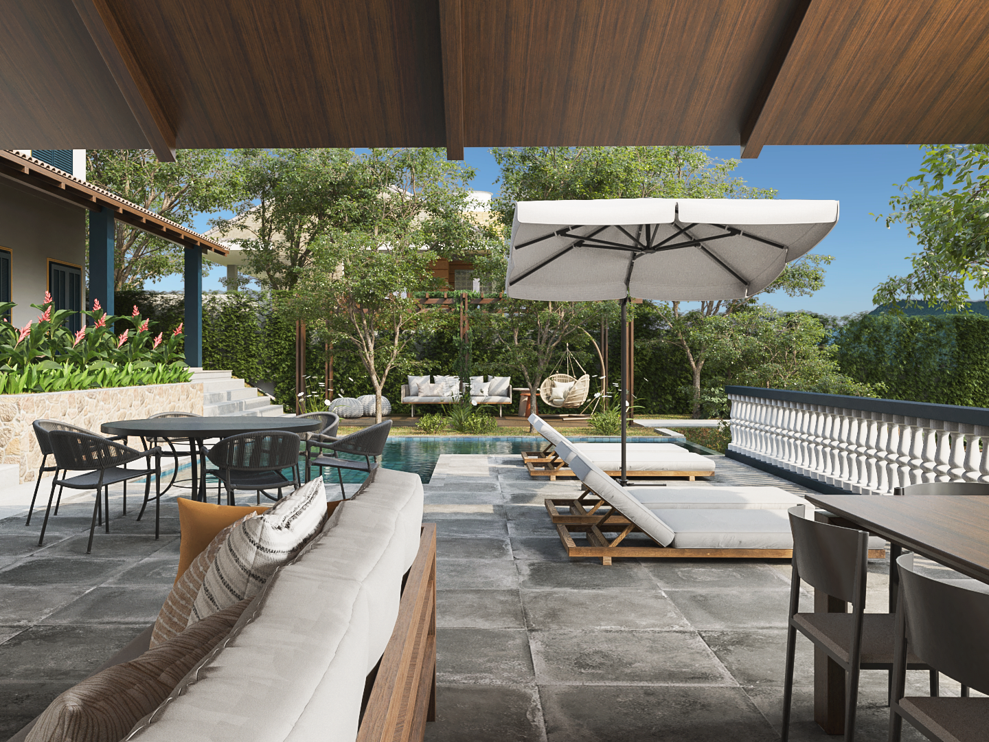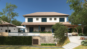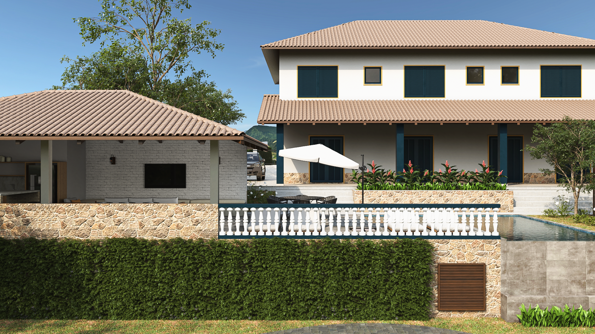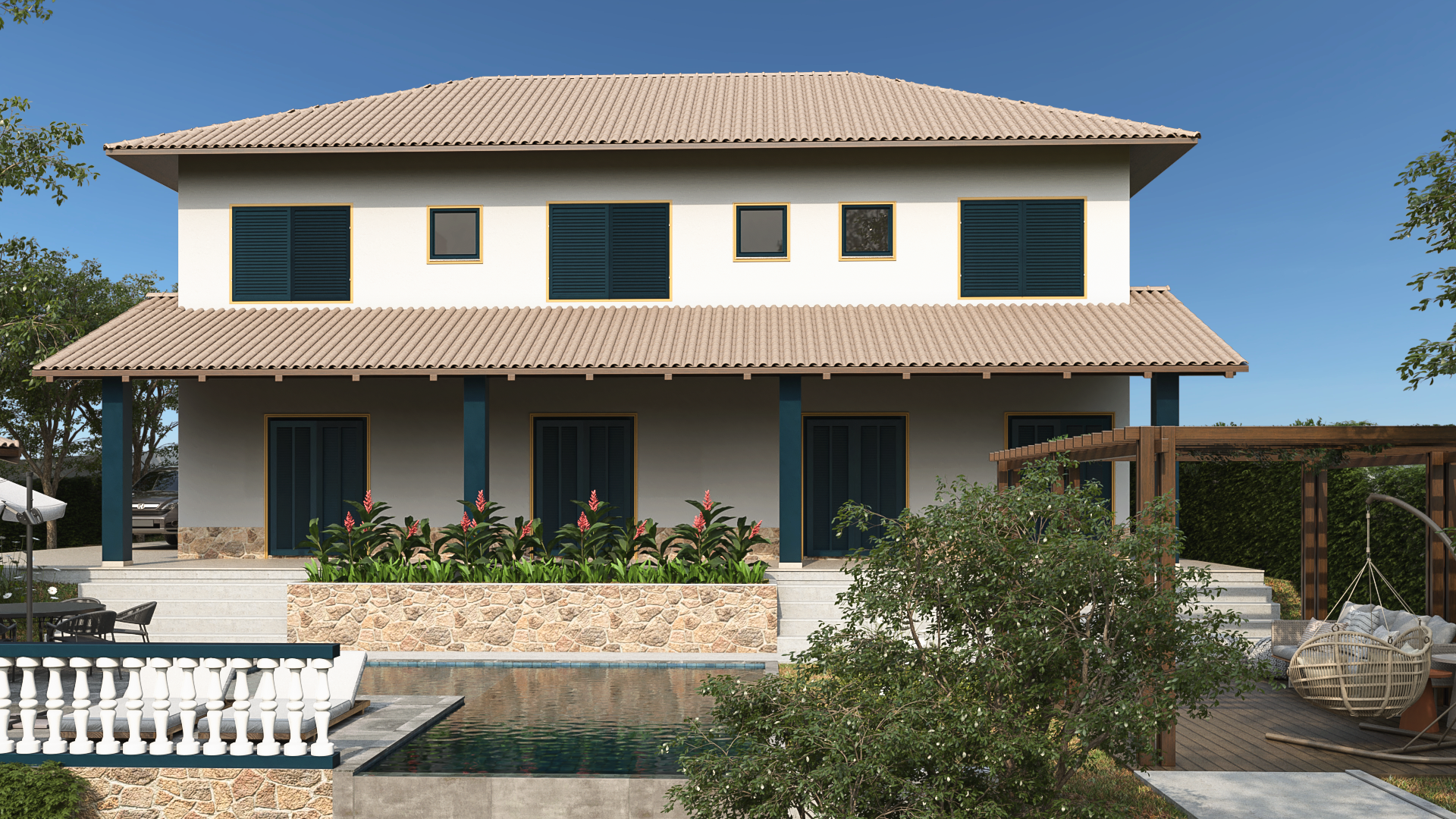 Uma casa de férias com alma colonial: telhado cerâmico, esquadrias marcantes, áreas externas generosas e ambientes preparados para reunir quem importa.